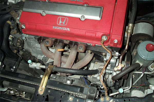 Lo scarico e' stato sostituito per intero. I collettori ora sono Mugen 4 in 1 JDM (JDM = per il mercato interno giapponese, ovvero flangiati da 60 mm. invece che da 50 mm. come i "nostri" europei), il catalizzatore e' un 100 celle regolarmente omologato, ed il resto dell'impianto e' artigianale. Tutto da 60 mm. Il silenziatore centrale simile all'originale, solo piu' grosso. Il finale e' una replica del Mugen Twin Loop. L'incremento di potenza rispetto alla configurazione originale e' avvertibile, con un miglior tiro un po' dappertutto, anche se la migliore erogazione si avverte piu' che altro agli alti regimi.